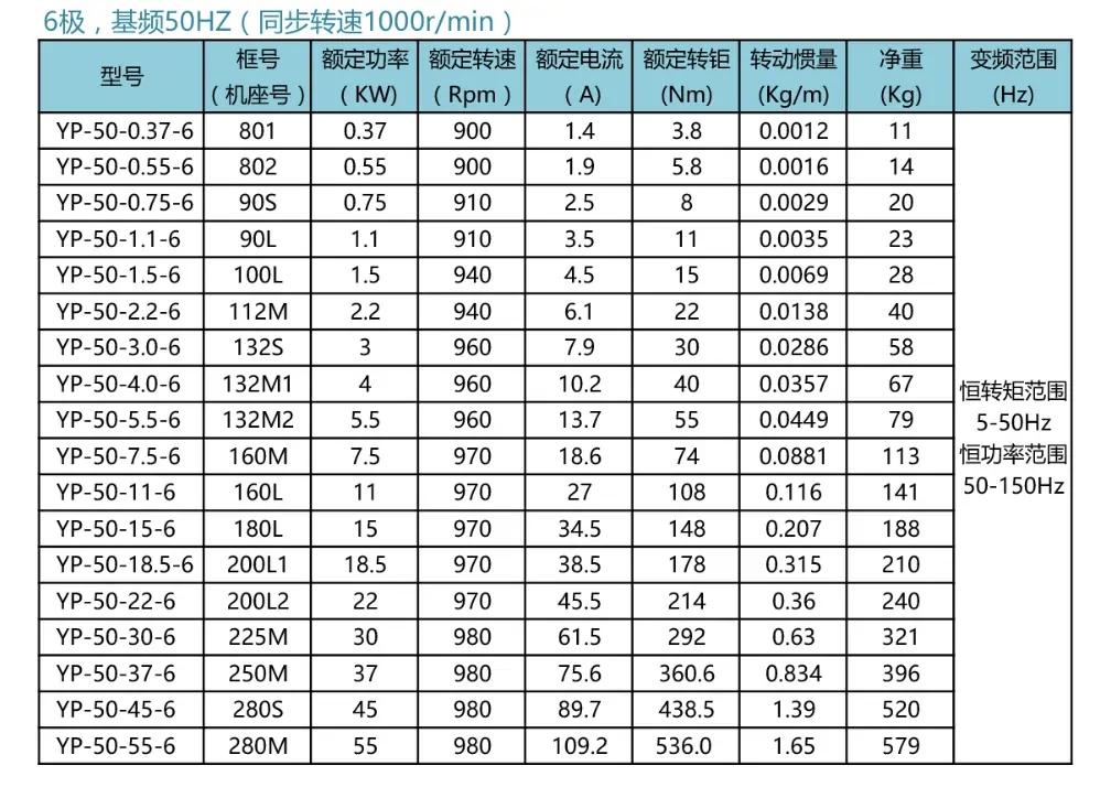 YP變頻系列6極型號