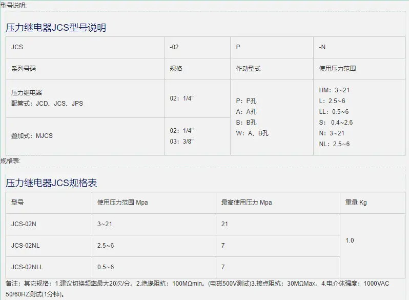 壓力繼電器JC-JCS有如下型號(hào):JC-JCS-02-1 JC-JCS-02-N-1 JC-JCS-02-NL-1 JC-JCS-02-NLL-1