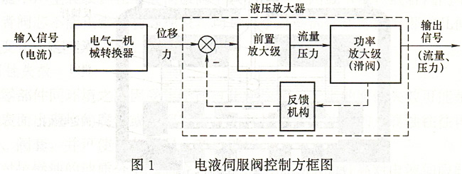 電液伺服閥由電氣一機械轉換器和液壓系統放大器構成,如圖1所示。電氣一機械轉換器是將電信號轉換成機械位移;液壓放大器是將電氣一機械轉換器輸出的機械位移放大后推動閥芯運動,液壓放大器由前置放大級和功率放大級組成,前置放大級采用滑閥、噴嘴擋板閥或射流管閥,功率級采用滑閥形式。