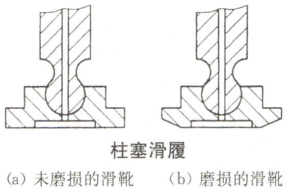 為了延長液壓油泵的使用壽命,必須定期在油路的紊流處取出油樣檢驗。保持油液的清潔度是系統(tǒng)維護保養(yǎng)的重要內容,有時系統(tǒng)不能正常運行,就是因為控制閥閥芯被油污卡死,或產生阻尼、運動不暢。出現故障時又找不著其他原因,則清洗相關的控制閥(特別是比例閥)是重要的措施。軸向柱塞泵的損壞是從柱塞滑靴的磨損開始的,如下圖所示。當滑靴磨損到不能形成與斜盤間的靜壓油膜時,則滑靴與斜盤間的摩擦力增大,斜盤被拉傷,摩擦力進一步增大,回程盤破裂,泵的內部損毀,所以定期將磨損(還未完全損壞)的滑靴換掉就可以避免整泵的損壞。