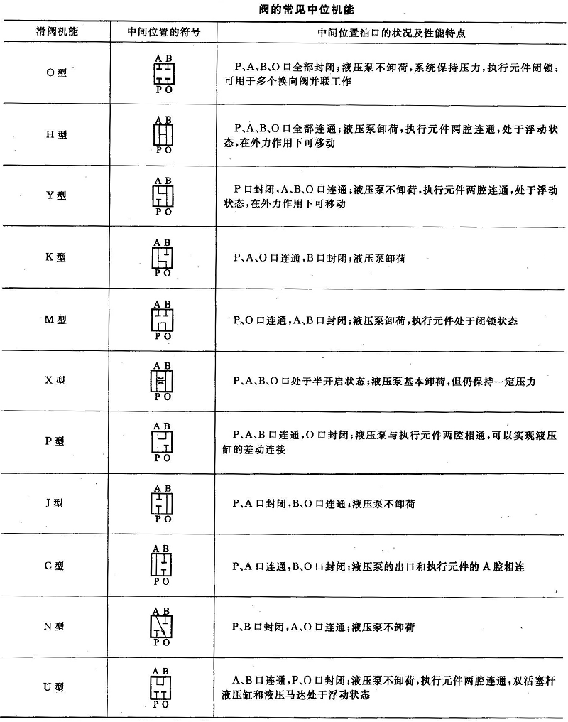 從事液壓行業的人都應該知道多位換向閥處于不同位置時,其各油口的連通情況是不同的,控制機能也不一樣。因此,把滑閥閥口的連通形式稱為滑閥機能。對于三位閥來說,則把閥芯處于常態位(即中位)各油口的連通形式稱為滑閥的中位機能(類似,三位閥的左、右位分別稱為左、右位機能)。下表列出了閥的常見中位機能。三位五通閥的情況與之相似。不同的中位機能是通過改變閥芯的形狀和尺寸實現的,它可以實現不同的控制和滿足不同的使用要求。