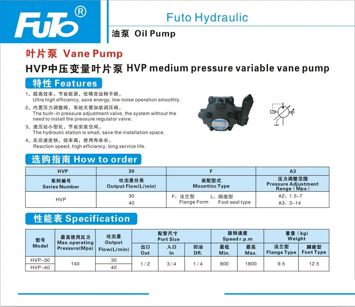 FUTO液壓變量葉片泵HVP-15/20/30/40-FA3平鍵花鍵油泵